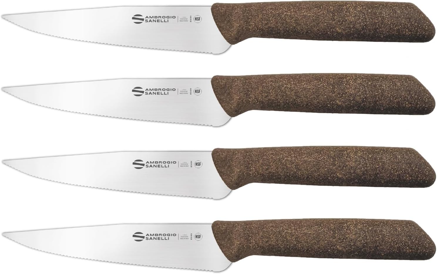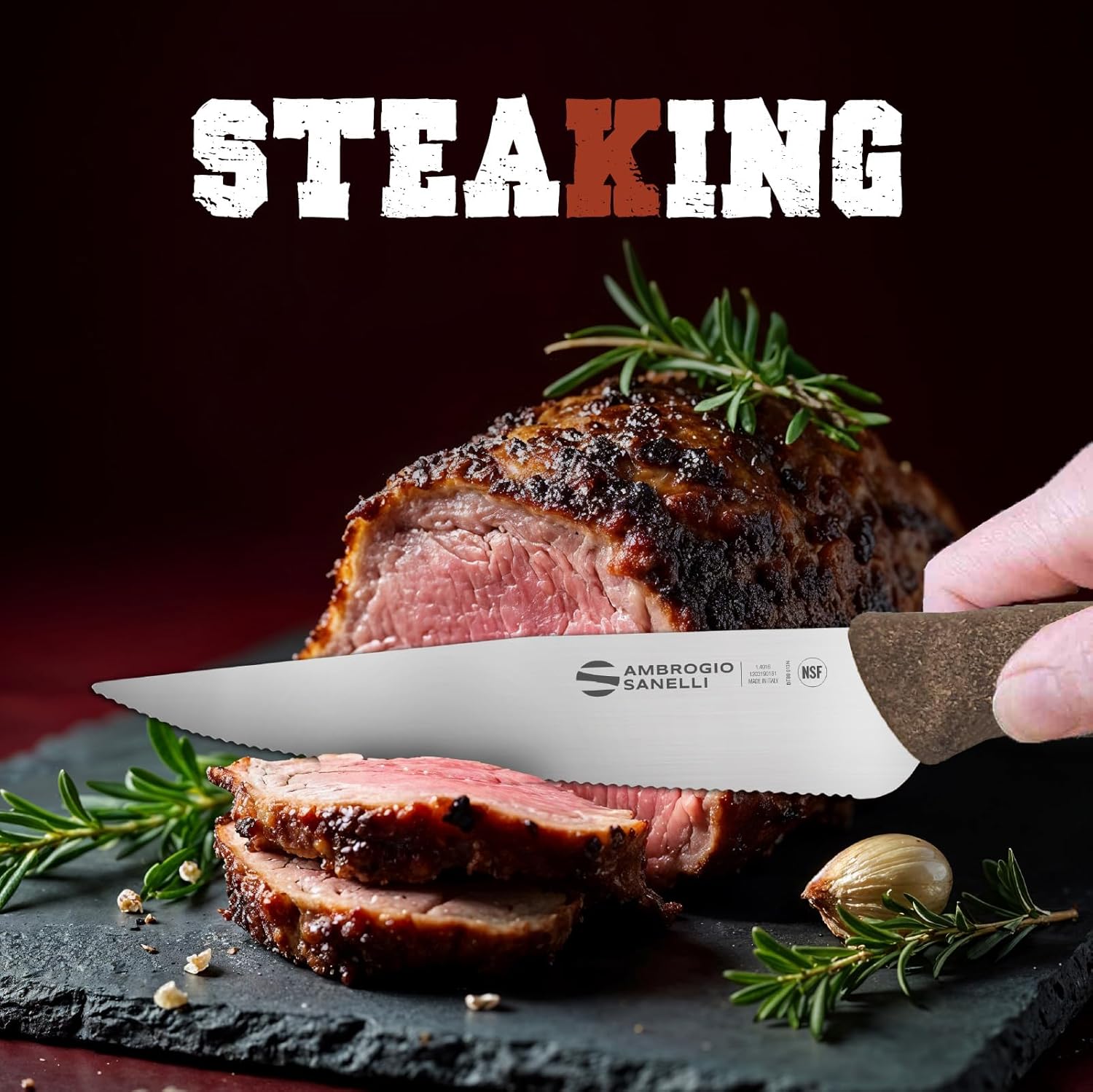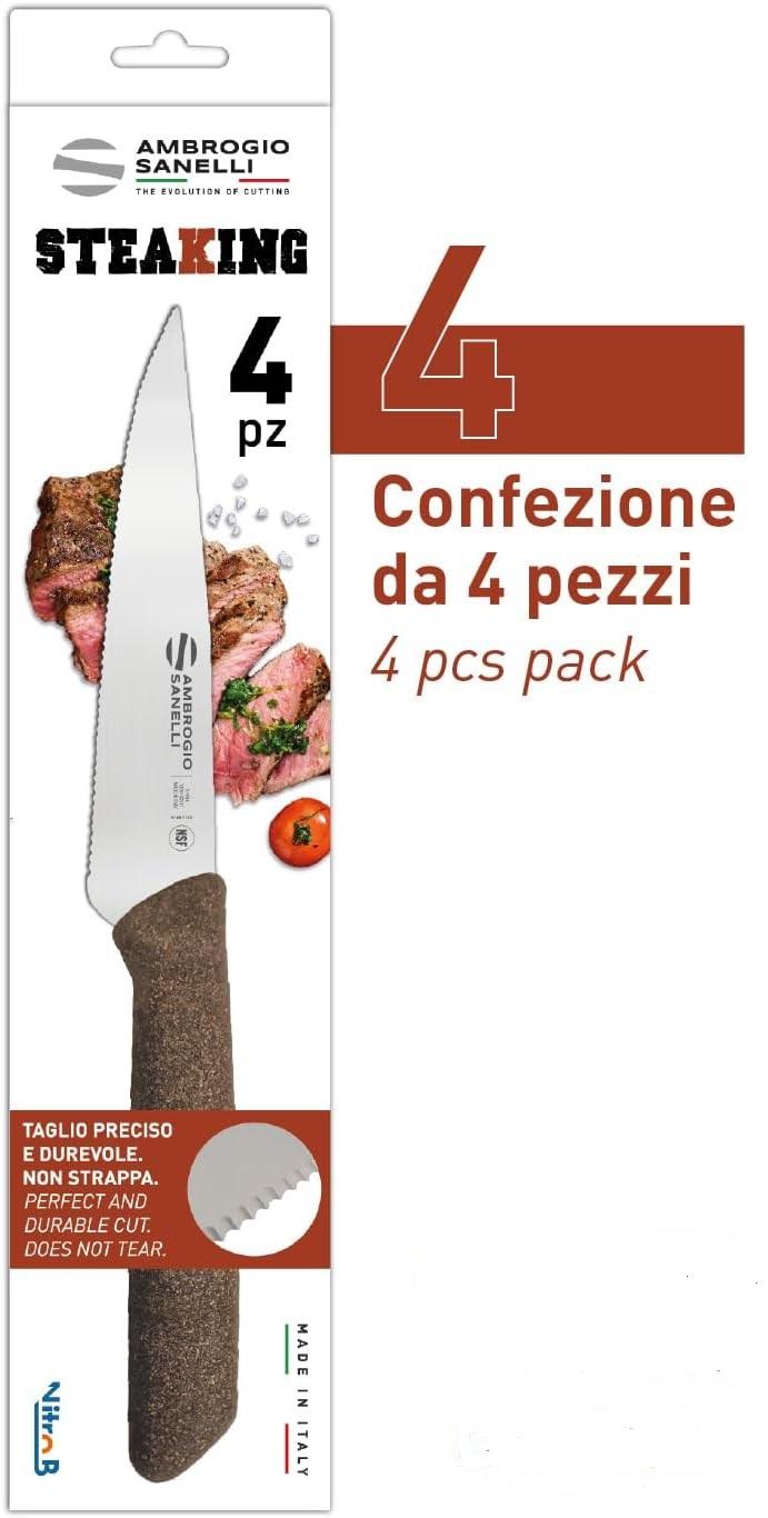 STEAKING è il coltello che Ambrogio Sanelli ha progettato pe realizzare porzioni di carne perfette grazie alla sua microdentatura. Essa garantisce tagli lisci ed omogenei, senza strappare le fibre della carne. La lama in acciaio inox da 13cm è realizzata in acciaio speciale all’Azoto per garantire una notevole tenuta del taglio ed un’ottima resistenza alla corrosione. Il manico ergonomico è realizzato in uno speciale materiale polimerico contenente legno naturale, resistente alle alte temperature ed al lavaggio, coniugando funzionalità e cura del design. Il lavaggio a mano è preferibile. In ogni caso, anche dopo il lavaggio in lavastoviglie è consigliato asciugare subito le lame.